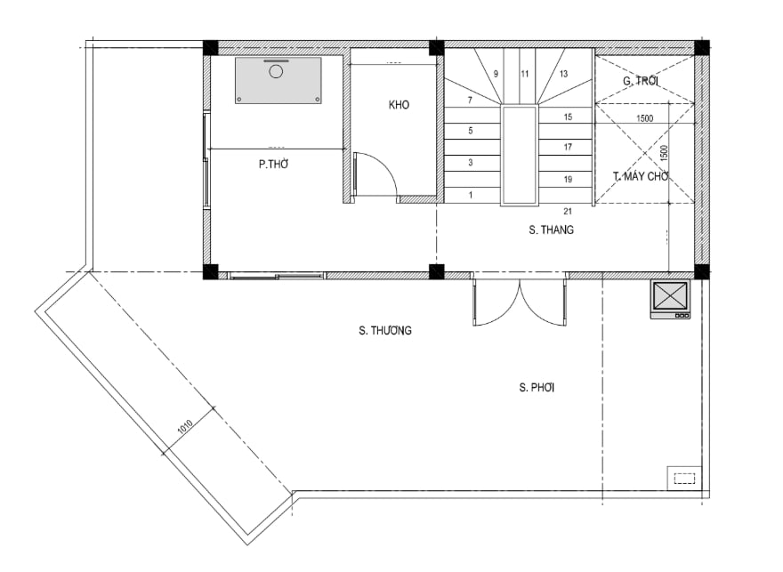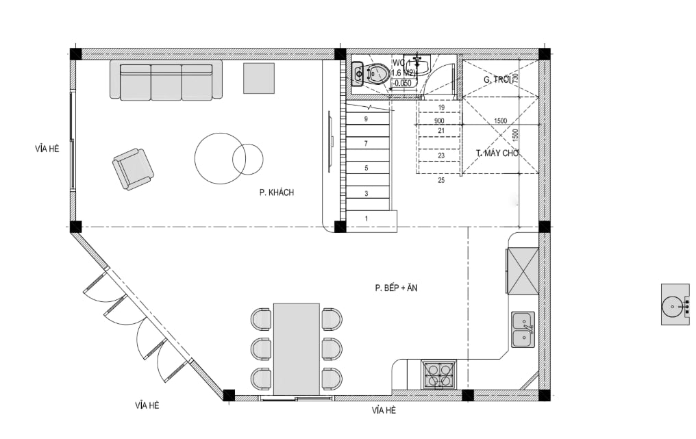+ Tầng 1: Phòng khách + Phòng bếp ăn + wc