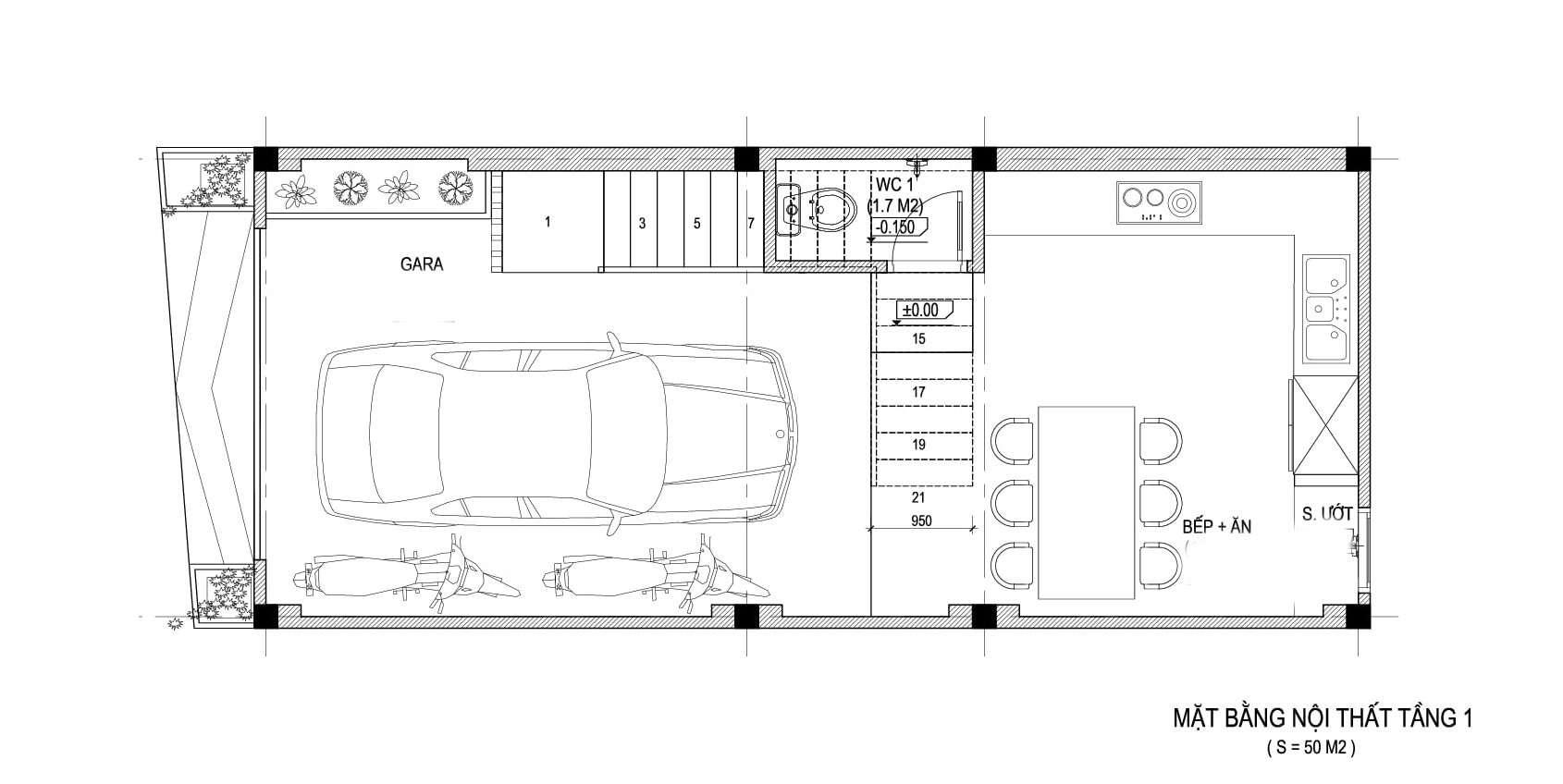 Gara + Bếp ăn + Sân ướt + 1 WC