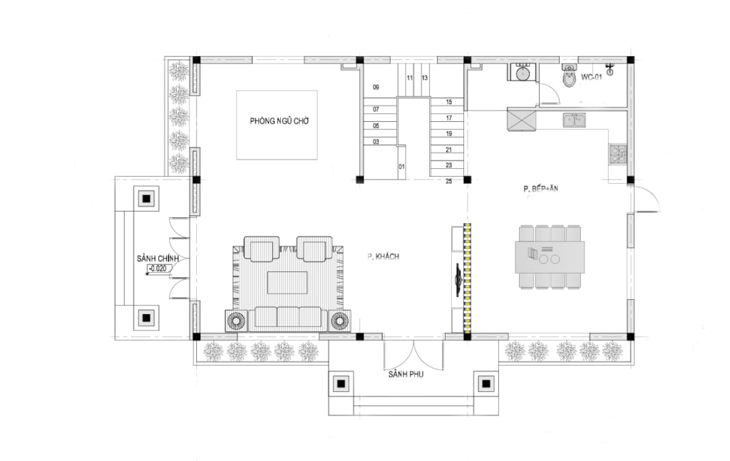 + Tầng 1: Phòng khách + Phòng bếp + 1 Phòng ngủ chờ + 1 WC