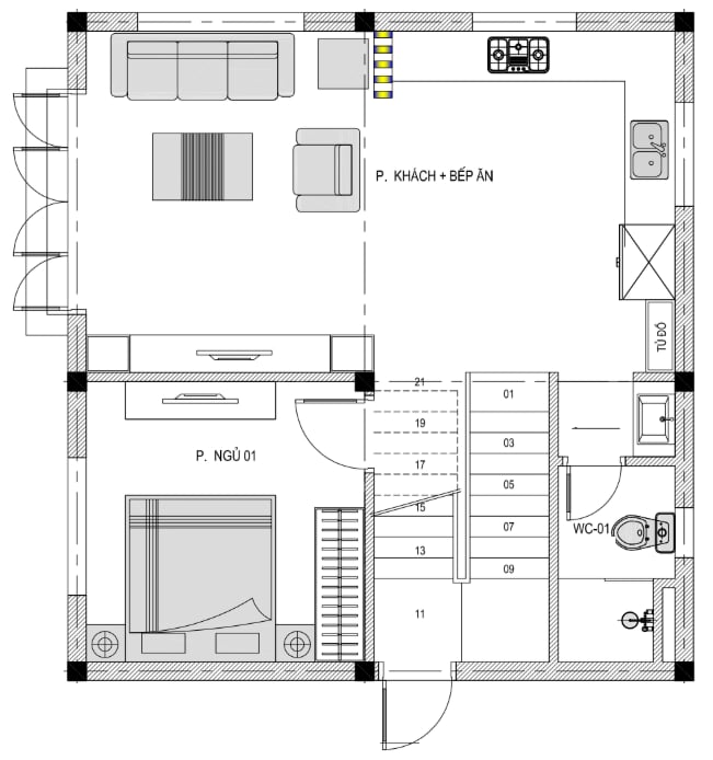 + Tầng 1: Phòng khách + Phòng bếp + 1 Phòng ngủ + WC