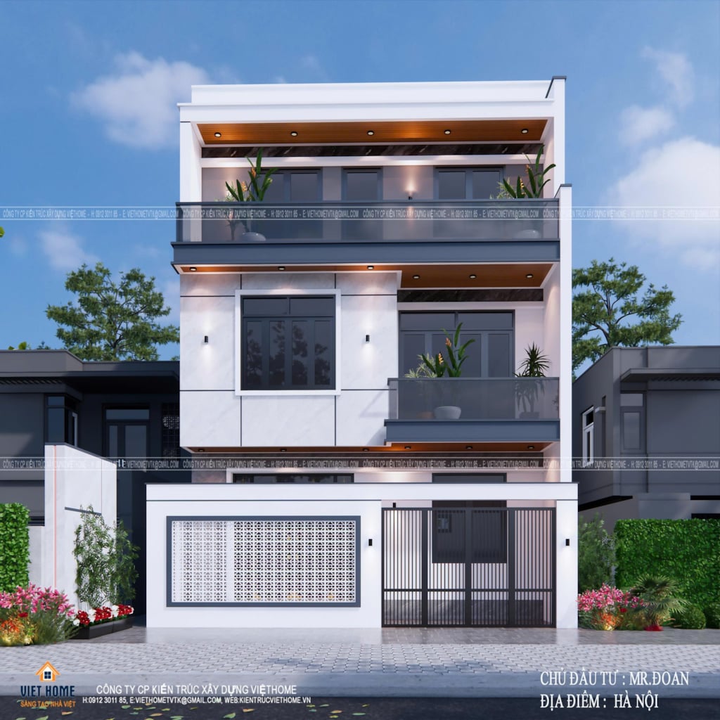 Mẫu biệt thự được xây dựng tại Quốc Oai mang vẻ đẹp đầy lôi cuốn, hấp dẫn với kiến trúc hiện đại, trẻ trung, sang trọng, được thiết kế với những đường nét hoa văn đơn giản không cầu kỳ, phức tạp, rườm rà, nổi bật với nhiều tiểu cảnh được bố trí hợp lý mang lại không gian xanh và lý tưởng để thư giãn. Chiêm ngưỡng ngay kiến trúc biệt thự hiện đại quy mô 3 tầng của gia đình anh Đoan để cảm nhận nét đẹp tinh tế, được các KTS lựa chọn kỹ càng các nguyên vật liệu thi công cao cấp, có độ bền cao cùng thời gian. Ở mặt tiền ngôi biệt thự được thiết kế vô cùng tỉ mỉ, hút mắt, chắc chắn bất kì ai ghé ngang qua đây sẽ đều bị “đánh gục” bởi nét thanh lịch hiếm có này. Mặt tiền của mẫu biệt thự hiện đại 3 tầng mái thái sử dụng gạch ốp cao cấp màu gỗ kết hợp với màu sơn trắng sáng giúp không gian mặt tiền như được mở rộng ra, sáng bừng cả một khu phố sầm uất, tấp nập tại Quốc Oai, Hà Nội mà gia chủ sinh sống.