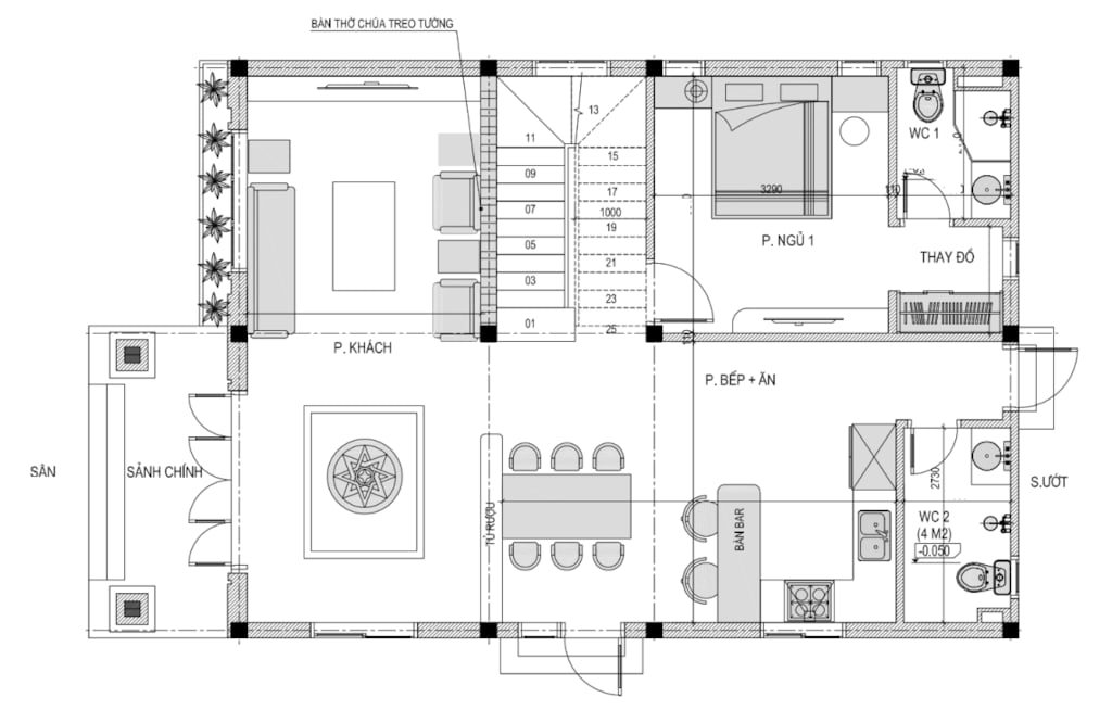 + Tầng 1: Phòng khách + Bếp ăn+ Phòng ngủ + 1 WC