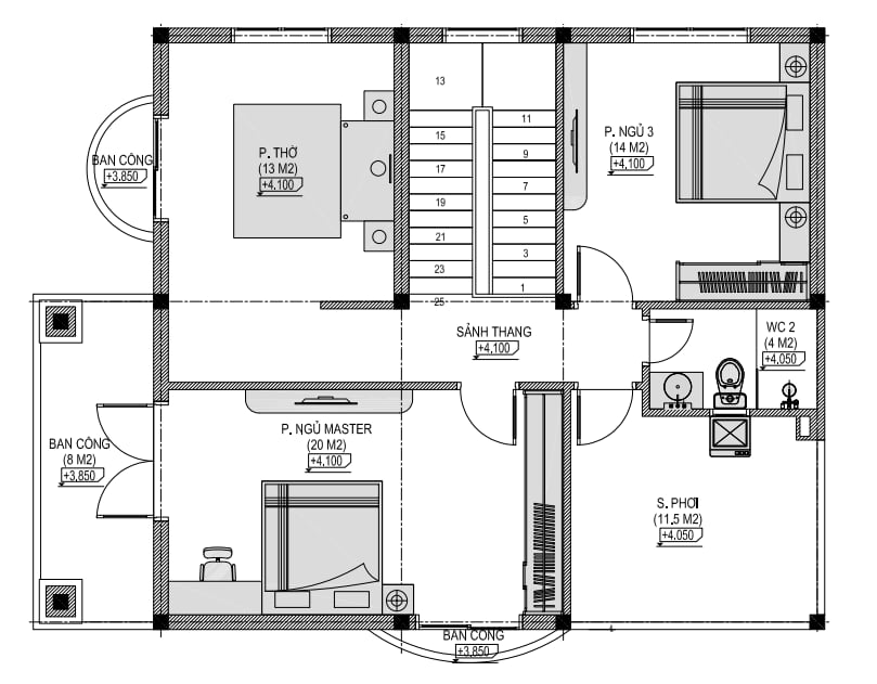 + Tầng 2: Phòng Thờ+ Phòng ngủ master + 2 Phòng ngủ thường + 1 WC