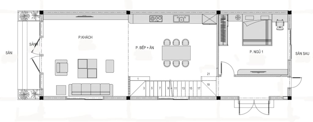 + Tầng 1: Phòng khách , Phòng Bếp + Ăn + 1 Phòng ngủ