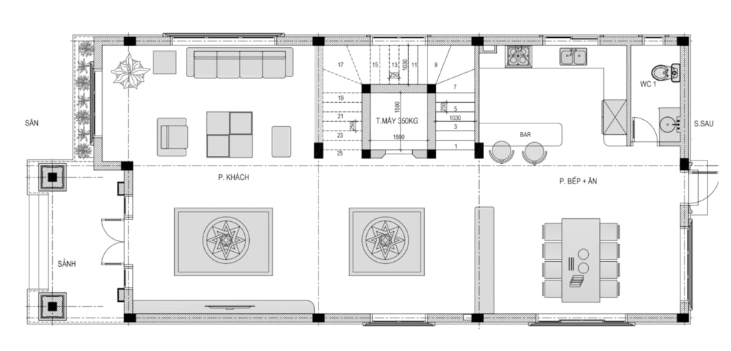 + Tầng 1: Phòng khách + Bếp ăn + 1 WC