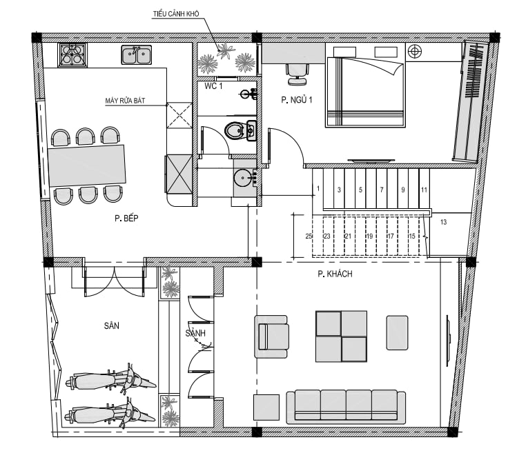 + Tầng 1: Phòng khách + Bếp ăn + Phòng ngủ + WC