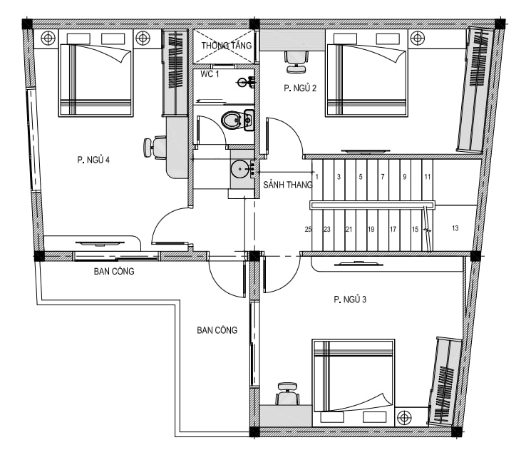 + Tầng tum: Phòng Thờ + Phòng ngủ + WC