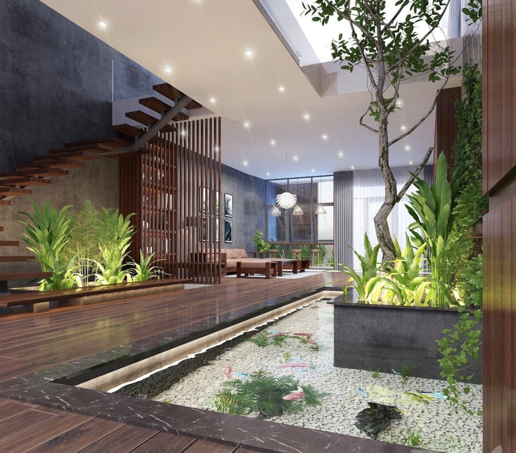 Giếng trời là nơi lý tưởng để làm vườn đứng, tiểu cảnh khô/nước, giúp tạo điểm nhấn thẩm mỹ và tăng độ ẩm tự nhiên.