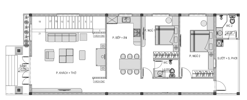 Phòng khách và phòng thờ + Phòng bếp + 1 Phòng ngủ khép kín + 1 Phòng ngủ thường + 1 WC