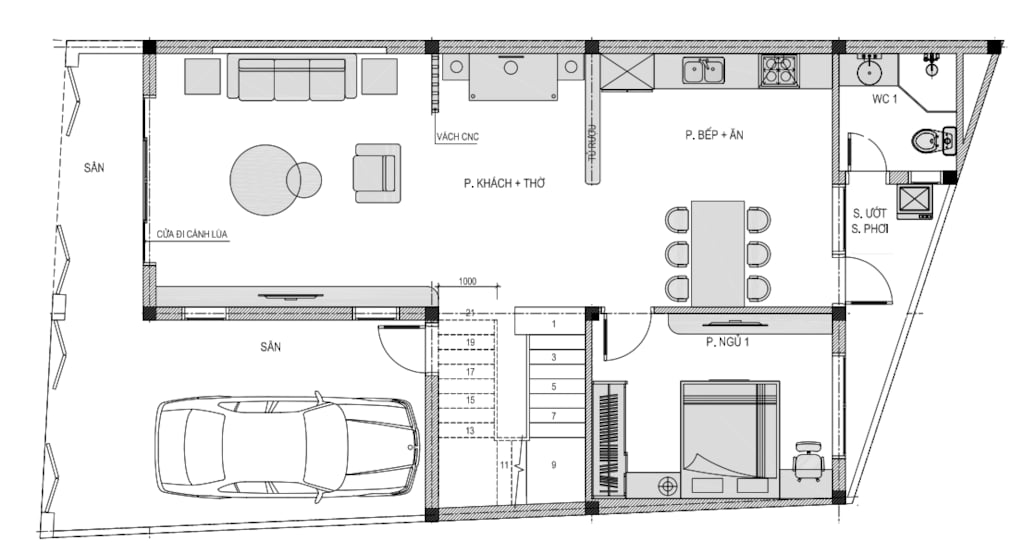 + Tầng 1: Phòng khách chung phòng thờ + Phòng Bếp + Ăn + 1 Phòng ngủ + 1 WC