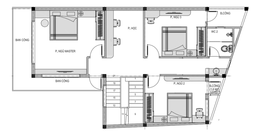+ Tầng 2: Khu vực học tập + 3 phòng ngủ + WC