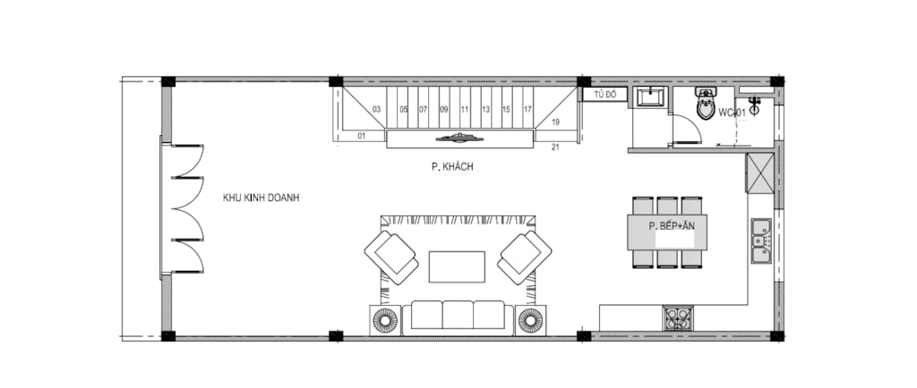 + Tầng 1: Khu kinh doanh + Phòng khách + Phòng Bếp, ăn + WC