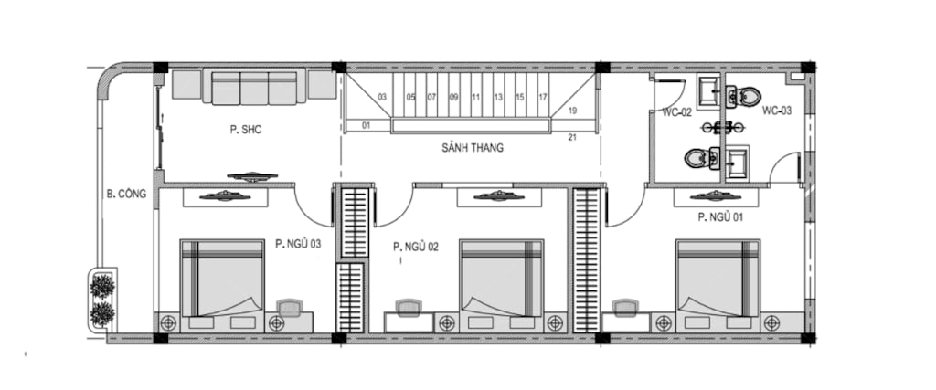 Khu vực SHC + Phòng ngủ khép kín + 2 Phòng ngủ thường + WC