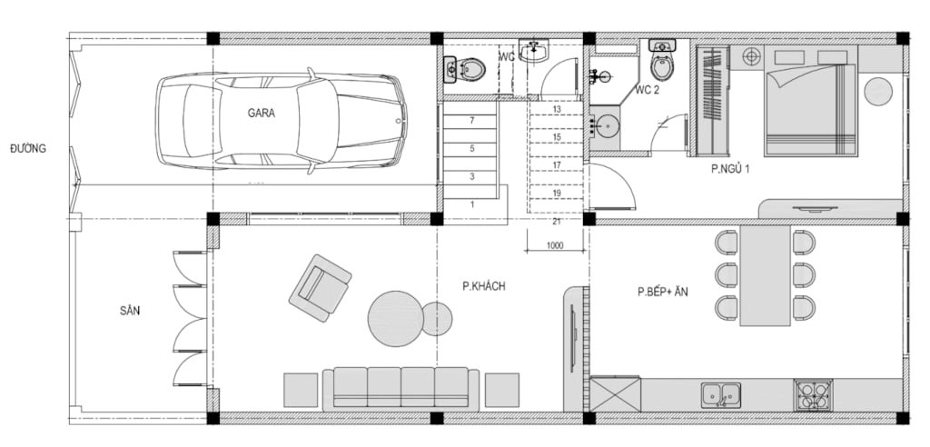 + Tầng 1: Gara + Phòng khách + Phòng bếp ăn + 1 Phòng ngủ khép kín + 1 WC