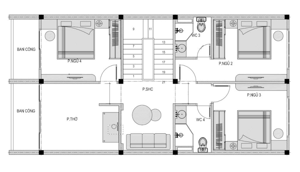 + Tầng 2: Phòng thờ + 2 Phòng ngủ + 1 Phòng ngủ khép kín + 1 WC