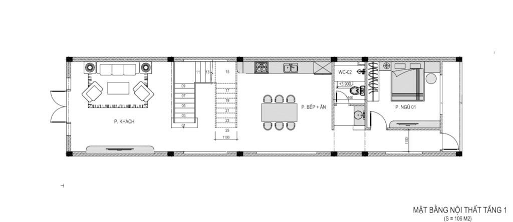 + Tầng 1: Phòng khách + Bếp + 1 Phòng ngủ + WC