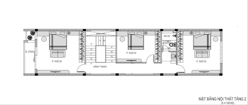 + Tầng 2: 3 Phòng ngủ + WC