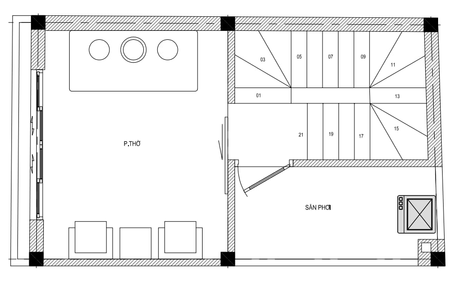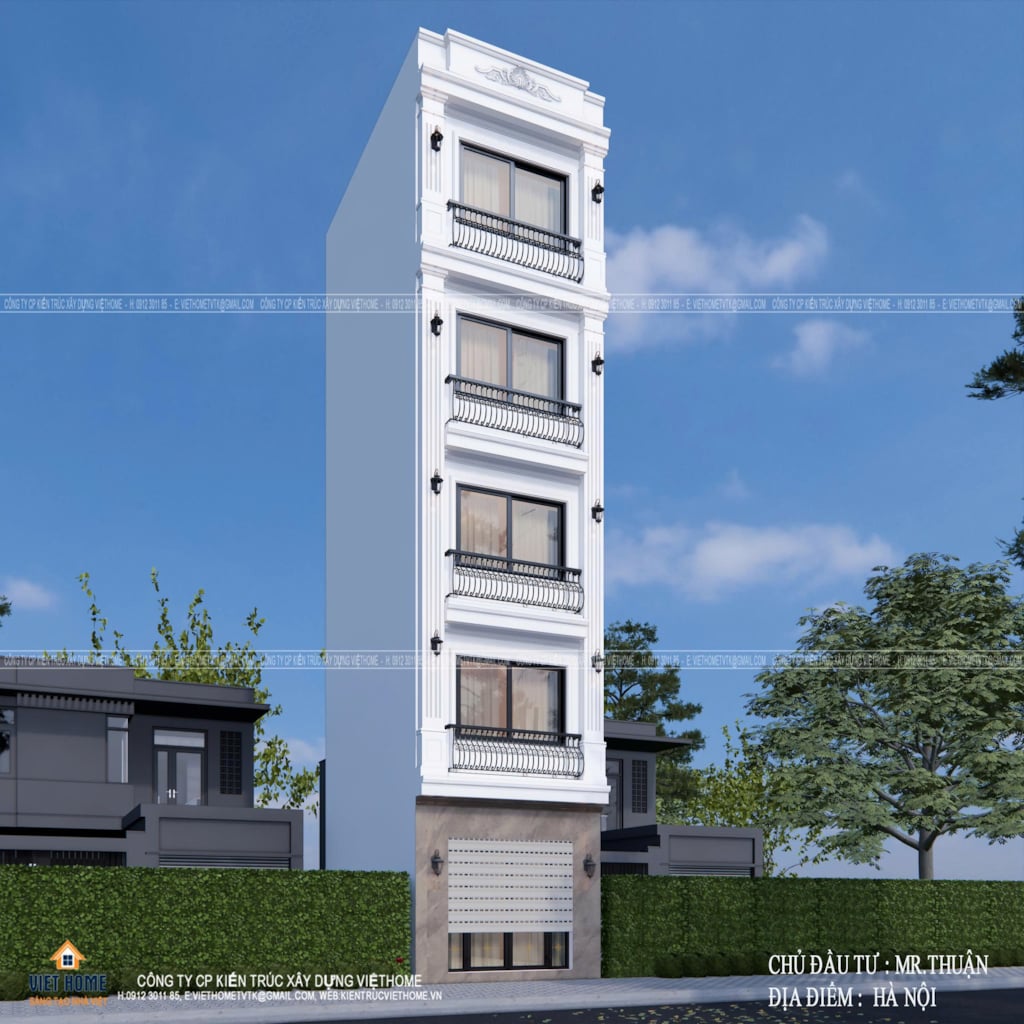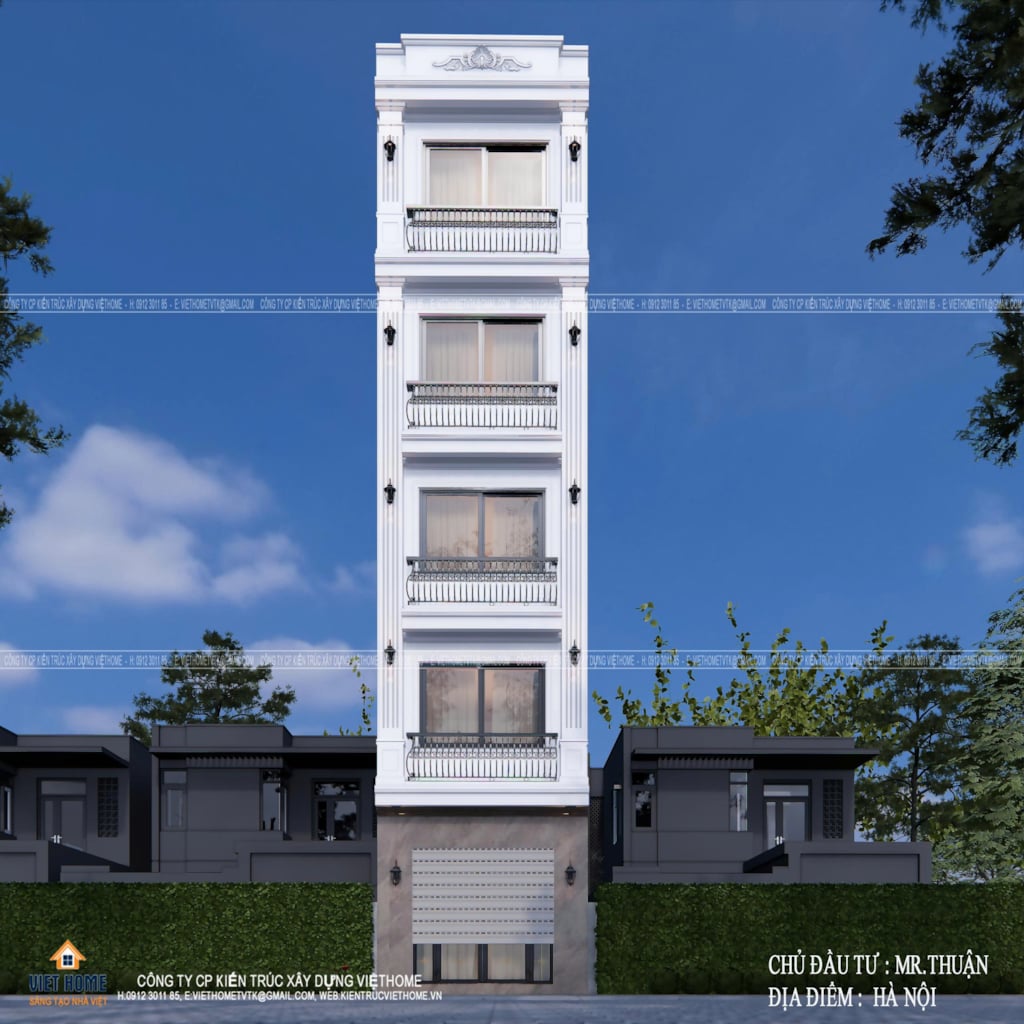 Sở hữu phong cách tân cổ điển theo yêu cầu của anh Thuận. Việt Home đã thiết kế ngôi nhà với hình khối rõ ràng, chi tiết được tạo ra tối giản từ họa tiết tới màu sắc. Trong đó nhấn nhá với các phù điêu nhẹ nhàng, hệ cột giả 2 bên, hệ lan can sắt mỹ thuật và hệ cửa mái vòm làm cho mẫu nhà phố ấn tượng và nổi bật với các thiết kế xung quanh. Nhìn tổng thể có thể thấy mẫu nhà phố đẹp hiện lên với dáng vẻ khỏe khoắn mặc dù chiều cao nhà khá lớn. Các KTS của Việt Home đã khéo léo tạo ra các thiết kế đảm bảo hình khối cân xứng với chiều cao với những tính toán tỉ mỉ, kỹ càng về tính an toàn, chi phí xây dựng và tính thẩm mỹ công trình.