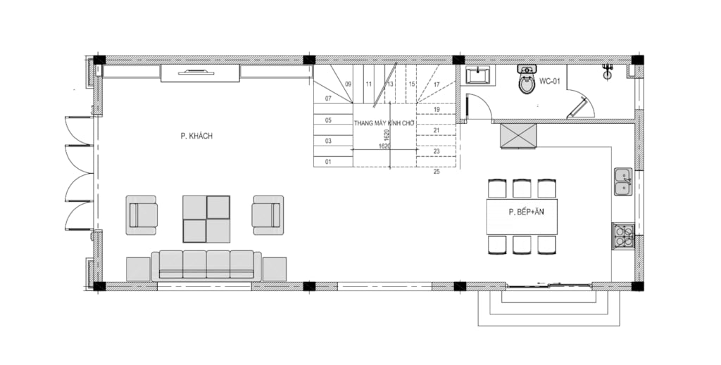 + Tầng 1: Phòng khách + Phòng bếp + 1 WC