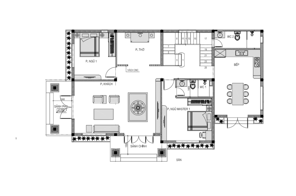 Tầng 1: Phòng khách + Phòng thờ + 1 Phòng ngủ master + 1 Phòng ngủ thường + Phòng bếp + WC