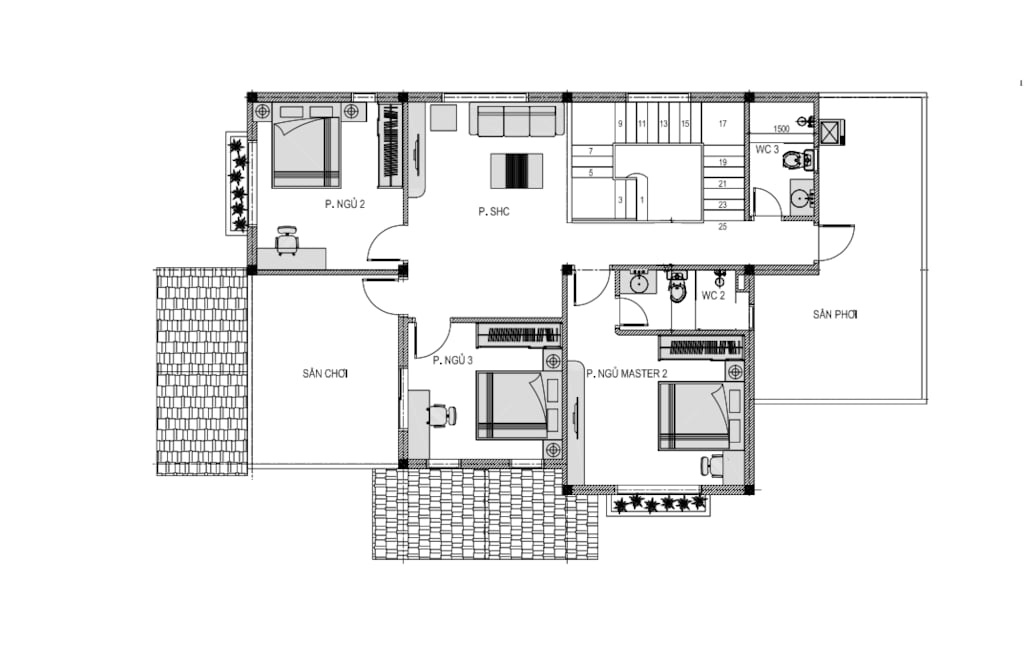 Tầng 2: Phòng SHC + 1 Phòng ngủ master + 2 Phòng ngủ thường + WC