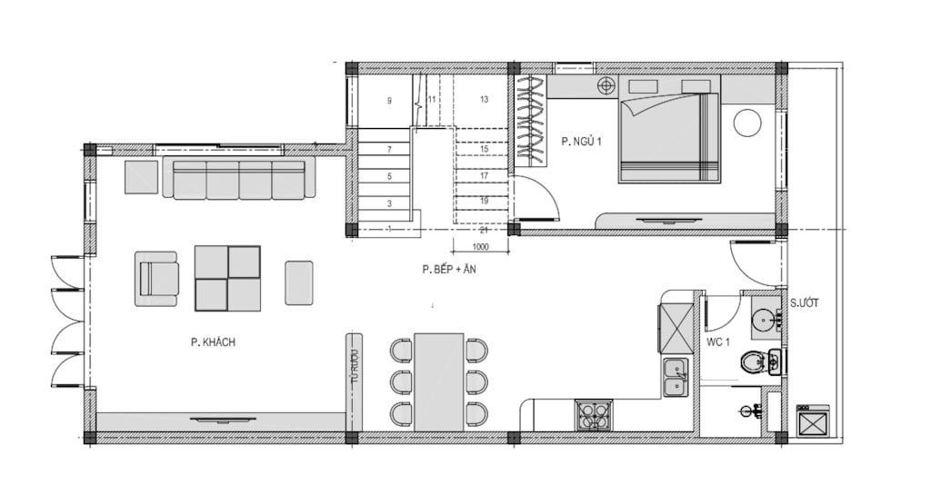 + Tầng 1: Phòng khách , Phòng Bếp + Ăn, 1 Phòng ngủ , 1 WC.