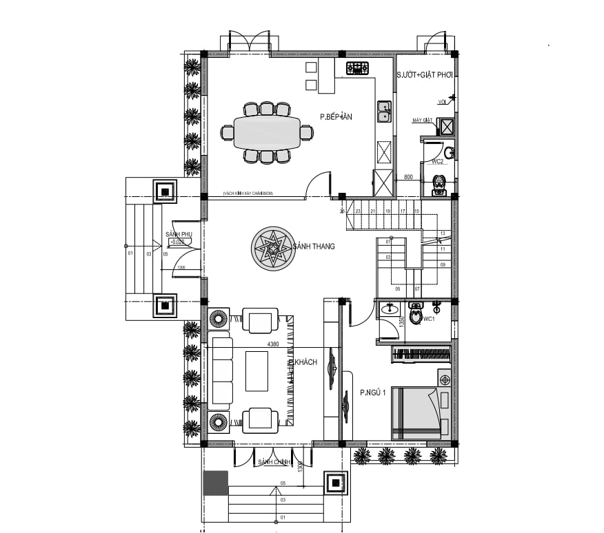 + Tầng 1: Phòng khách + Bếp ăn+ Phòng ngủ khép kín + 1 WC