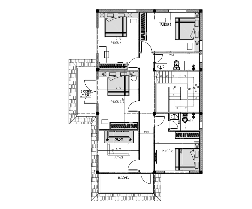 Phòng thờ + 1 Phòng ngủ Master + 3 Phòng ngủ + WC + Sân phơi