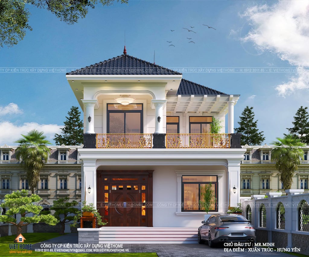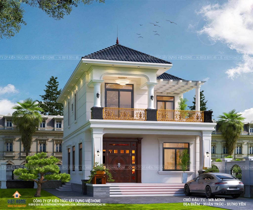 Hệ cột trụ lớn xuyên suốt hai tầng được xử lý vuông vức, mạnh mẽ, phần chân cột ốp đá màu tối tạo điểm nhấn chắc chắn, trong khi phần đầu cột được nhấn bằng phào chỉ tinh tế mang hơi hướng tân cổ điển, giúp mặt tiền vừa uy nghi vừa mềm mại. Khu vực ban công tầng 2 trở thành điểm nhấn đắt giá với lan can sắt mỹ thuật hoa văn uốn lượn tinh xảo, phủ sắc vàng sang trọng, góp phần nâng tầm giá trị thẩm mỹ và thể hiện rõ gu thẩm mỹ tinh tế của gia chủ. Hệ cửa kính lớn khung nhôm cao cấp được bố trí hợp lý, không chỉ giúp ngôi nhà luôn tràn ngập ánh sáng tự nhiên mà còn tạo chiều sâu, sự thông thoáng và kết nối hài hòa giữa không gian nội thất với cảnh quan bên ngoài.