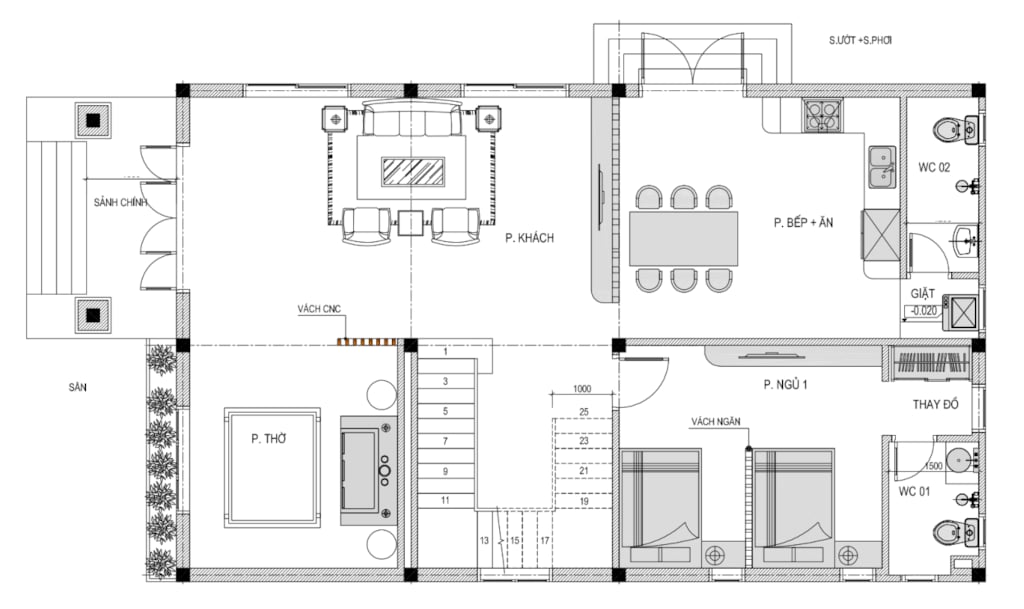 + Tầng 1: Phòng thờ + Phòng khách + Bếp ăn+ Phòng ngủ khép kín + 1 WC