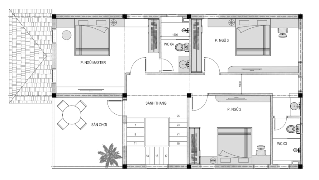 + Tầng 2: Phòng ngủ Master + 2 Phòng ngủ + WC + Sân phơi
