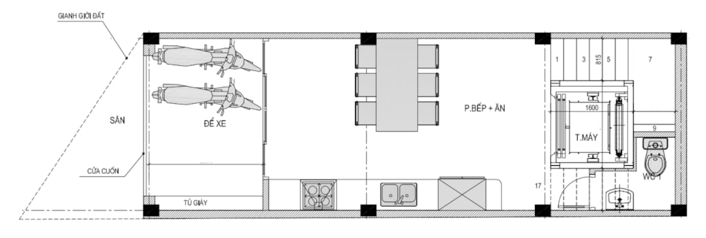 + Tầng 1: Để xe + Bếp ăn + WC