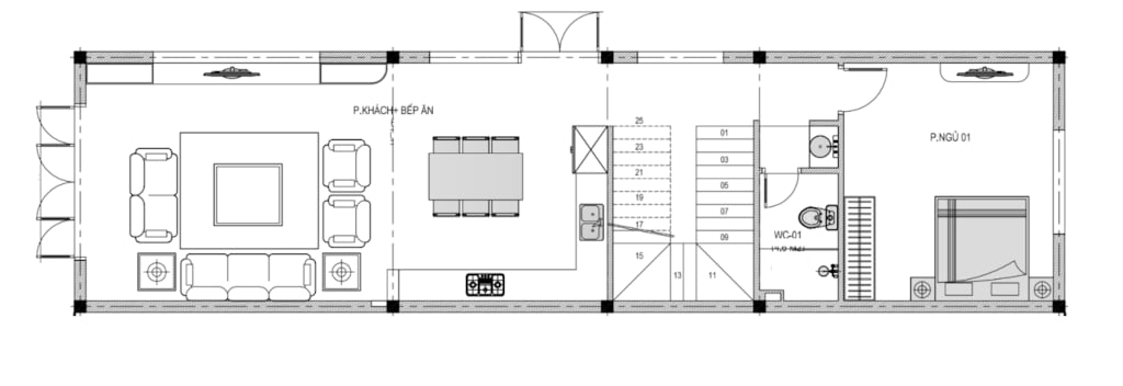 + Tầng 1: Phòng khách + Phòng bếp ăn + Phòng ngủ + wc