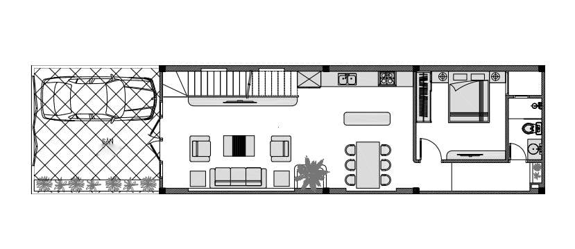 + Tầng 1: Phòng khách + Bếp ăn + Phòng Ngủ + WC