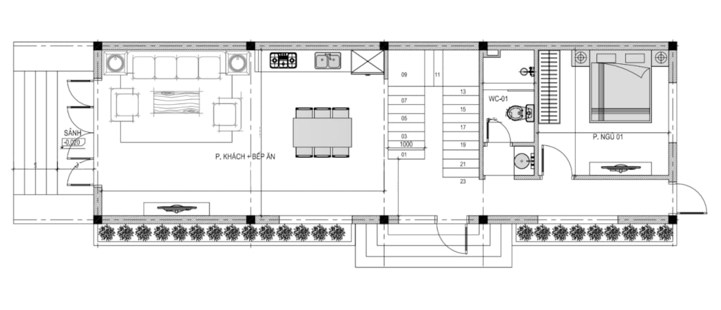 + Tầng 1: Phòng khách + Phòng bếp + 1 Phòng ngủ + wc