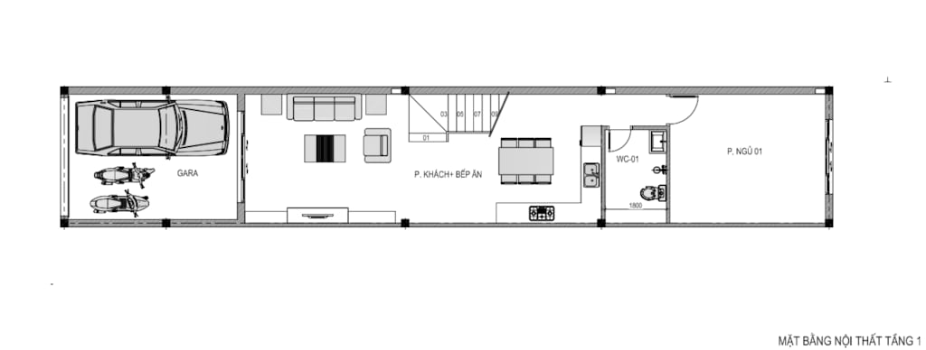 + Tầng 1: Gara + Phòng khách + Phòng bếp + 1 Phòng ngủ + WC