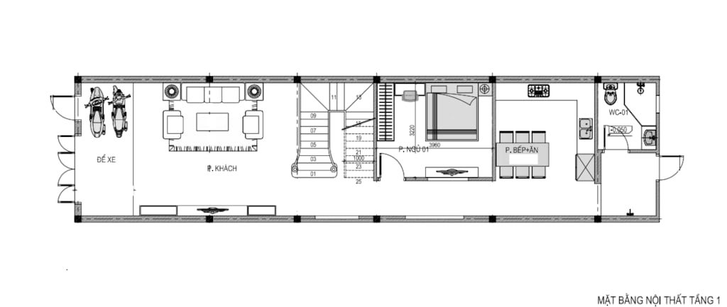 Sân để xe + Phòng khách + 1 Phòng ngủ + Phòng bếp + WC