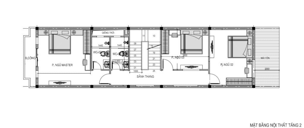 + Tầng 2: 1 Phòng ngủ master + 2 Phòng ngủ thường + 1 WC