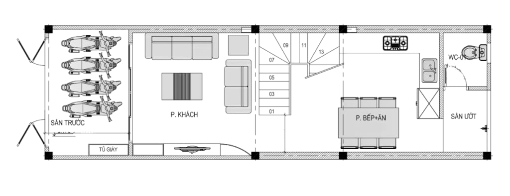 + Tầng 1: Sân để xe + Phòng khách + Phòng bếp + WC