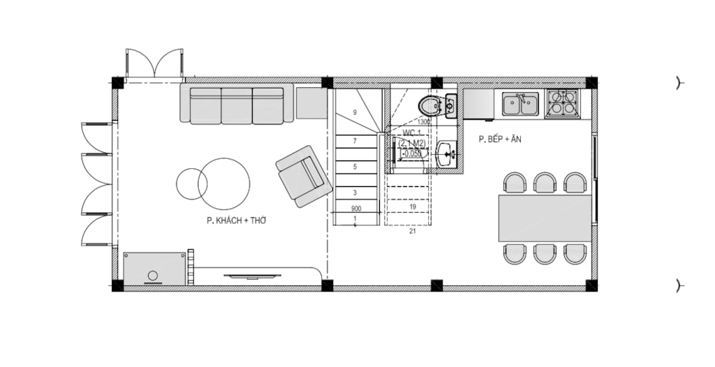 + Tầng 1: Phòng khách chung thờ + Phòng bếp + WC