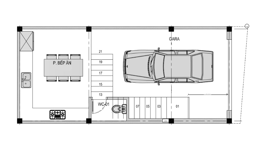 + Tầng 1: Gara + Bếp ăn + WC