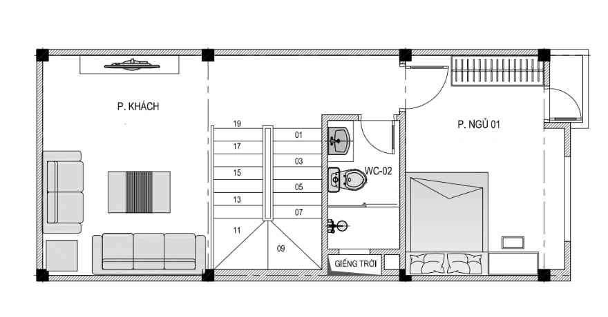 + Tầng 2: Phòng khách + phòng ngủ + WC