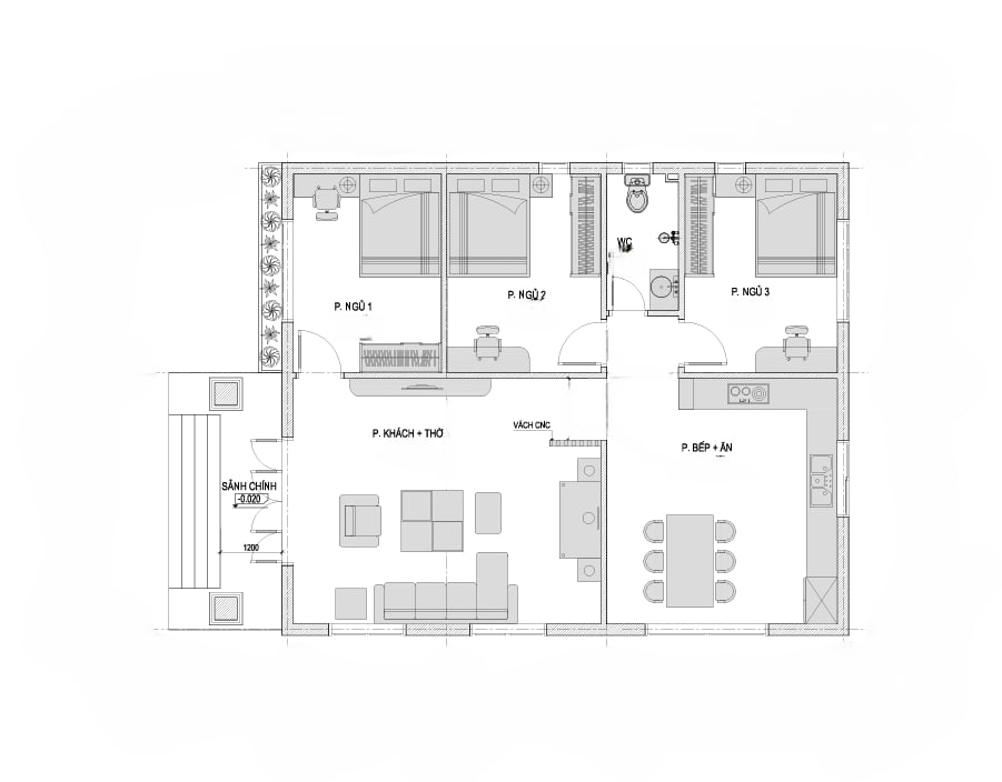 Công năng sử dụng: Phòng khách chung phòng thờ + Bếp + 3 Phòng ngủ + 1 WC