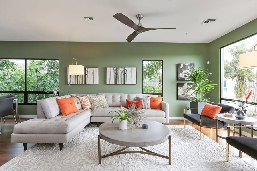 Phòng khách: Be ấm kết hợp điểm nhấn cam/đỏ