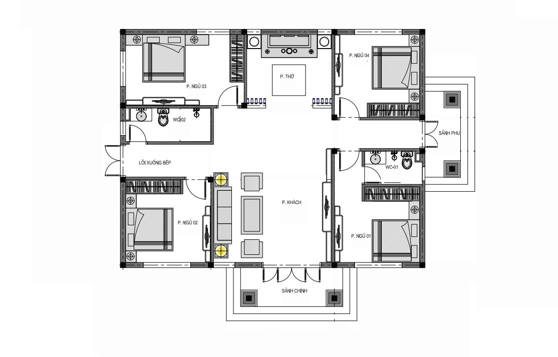 - Công năng sử dụng: Phòng khách + Phòng thờ + Phòng bếp ăn + 1 Phòng ngủ master + 3 Phòng ngủ thường + 1 WC