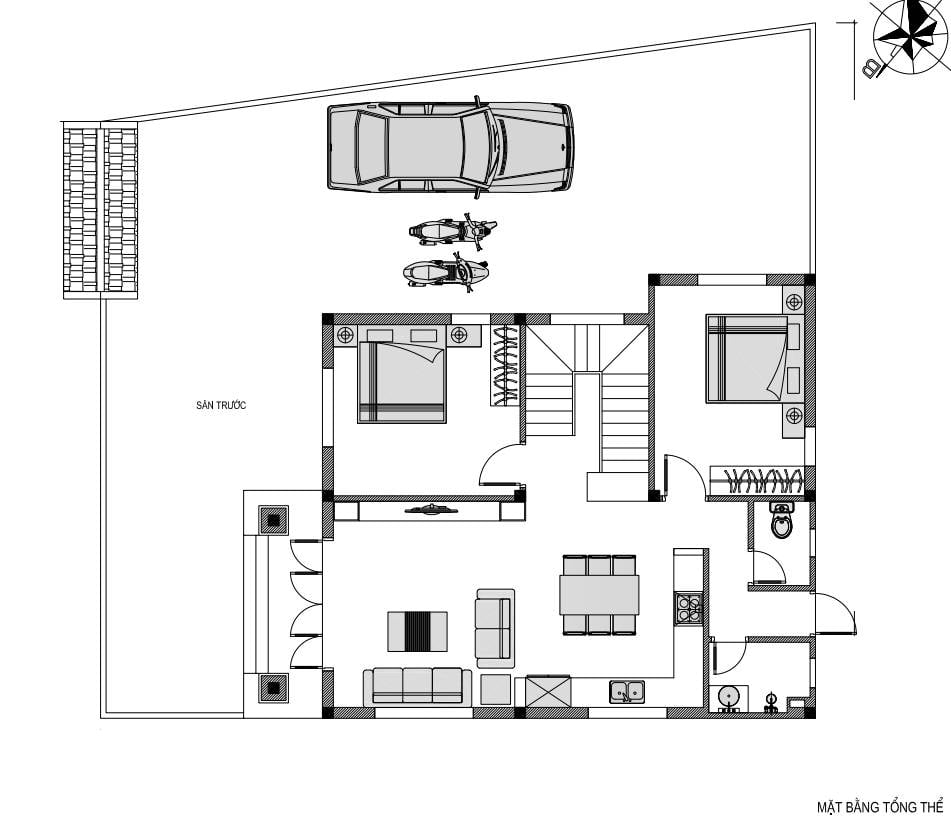 + Tầng 1: Phòng khách + Bếp ăn + 2 Phòng ngủ + WC