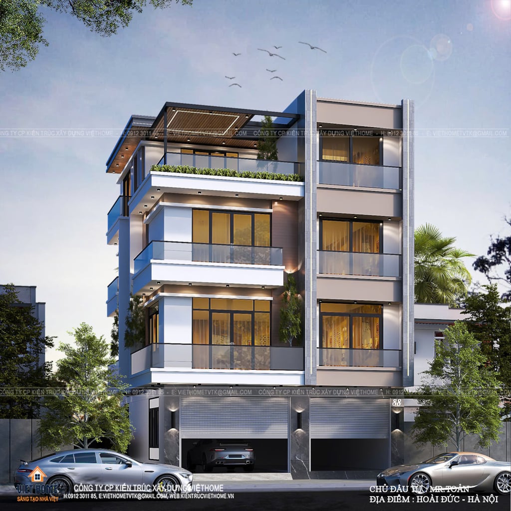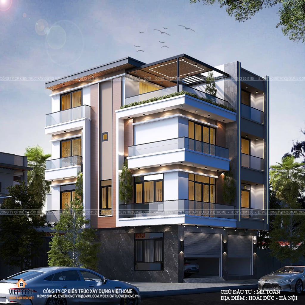 Xen kẽ giữa các tầng là mảng xanh bố trí tinh tế tại ban công, giúp làm mềm kiến trúc, giảm cảm giác khô cứng của vật liệu hiện đại và tạo nên điểm nhấn sinh động cho mặt tiền. Hệ trần ban công và mái che được thiết kế gọn gàng, kết hợp ánh sáng âm trần, giúp công trình trở nên nổi bật và cuốn hút hơn khi về đêm. Tổng thể mặt tiền là sự kết hợp hài hòa giữa tính tiện dụng cho kinh doanh ở tầng 1 và không gian sống hiện đại, đẳng cấp ở các tầng trên, thể hiện rõ tư duy thiết kế thông minh và gu thẩm mỹ tinh tế của gia chủ trong bối cảnh đô thị năng động ngày nay.