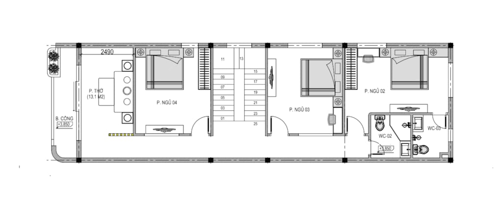 + Tầng 2: Phòng thờ + 1 Phòng ngủ master + 2Phòng ngủ thường + 1 WC