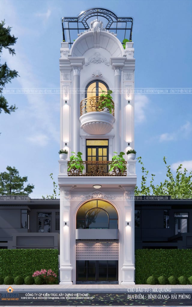 Ban công các tầng được thiết kế rộng thoáng với lan can sắt mỹ thuật uốn cong mềm mại, tạo điểm nhấn cho mặt tiền đồng thời mang đến những khoảng không gian thư giãn giàu tính thẩm mỹ. Cửa kính cường lực khung viền sang trọng giúp tối ưu ánh sáng tự nhiên, mang đến vẻ ngoài hiện đại xen lẫn cổ điển đặc trưng.