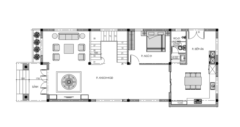 + Tầng 1: Phòng khách + Phòng bếp ăn + 1 Phòng ngủ + 1 WC
